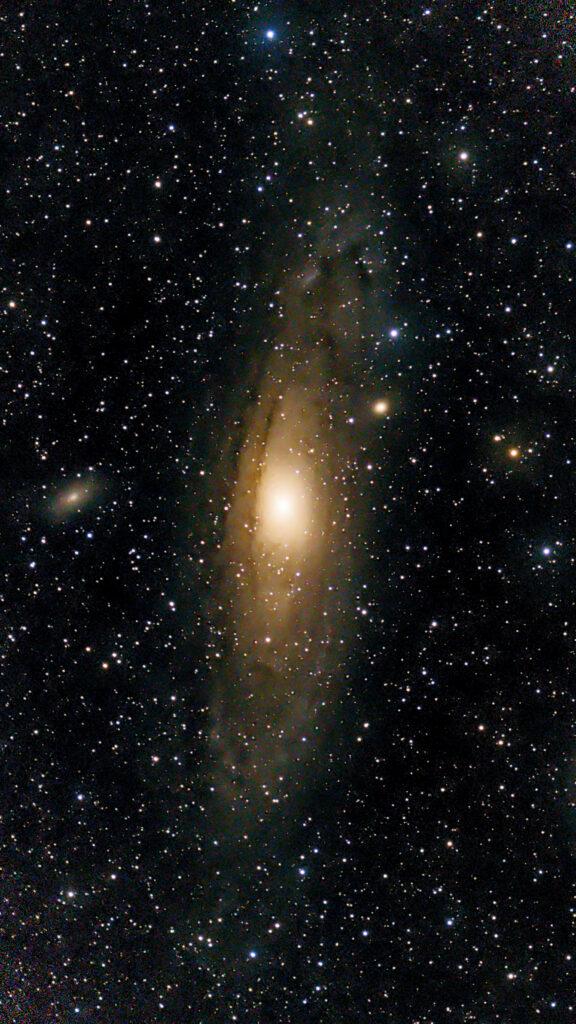 The image of the Andromeda galaxy is a mosaic of two 100×60 second images and one 25×60 (shortened due to clouds) stictched together in Microsoft ICE. They were stacked in Maxim DL5 and tweaked with RawTherapee 5.8.